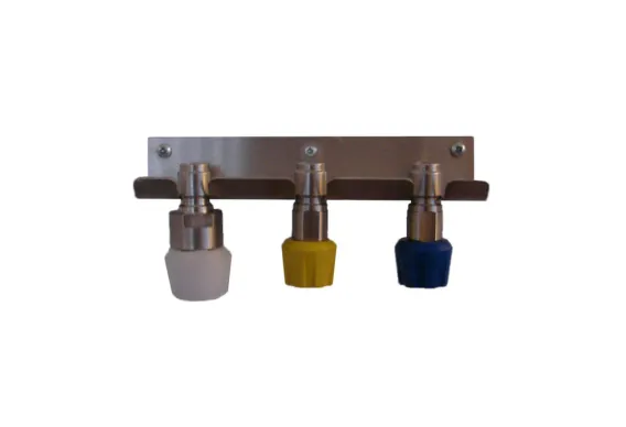 The Nozzle Holder with ST3100 Quick Coupling is a versatile, stainless steel solution designed for efficient cleaning in the food industry. This holder features three interchangeable nozzles- white (50°/200, foam), yellow (25°/50, rinse), and blue (15°/30, disinfect)-allowing you to easily switch between foam, rinse, and disinfection tasks by simply changing the nozzle. The robust ST3100 quick coupling ensures fast, secure connections to your cleaning system, while the durable stainless steel construction guarantees long-lasting performance, even in demanding environments. Ideal for food processing and hygiene-critical applications, this nozzle holder streamlines your workflow and provides reliable, high-quality results at pressures up to 150 bar and temperatures up to 100°C