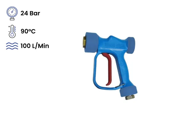 The RB65 On/Off Spray Gun is a robust, low-pressure spray gun designed for up to 24 bar industrial cleaning applications. Featuring an ergonomic on/off trigger and a 360° swivel connection, this model delivers a high flow rate of 100 L/min and allows for easy attachment of a quick connector. Built for durability and user comfort, the RB65 ensures efficient, reliable washdown performance in demanding environments.