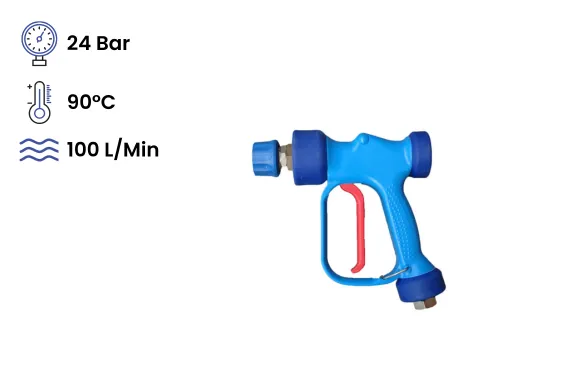 The RB65 On/Off Spray Gun is a robust, low-pressure spray gun designed for industrial cleaning applications up to 24 bar and 100 L/min flow rate. This model features a stainless steel ST3100 quick coupling for fast and secure attachment of your preferred nozzle or accessory-giving you complete flexibility to choose the right spray pattern for your task. The ergonomic design, 360° swivel connection, and durable construction ensure comfortable operation and long-lasting performance.